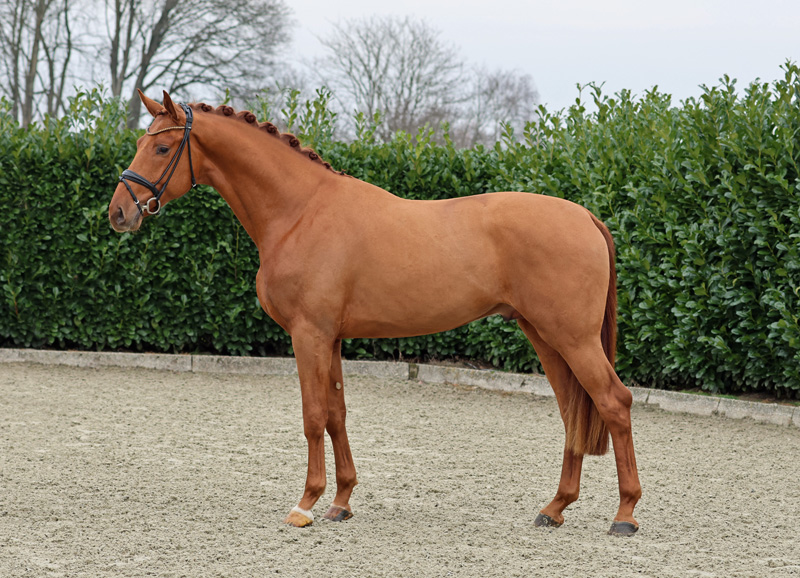 Hochmoderner Dressurnachwuchshengst mit auffälliger Präsenz und beeindruckendem Erscheinungsbild. Er besticht durch gleichmäßig elastische, bergauf getragene Grundgangarten und eine außergewöhnliche Leichtfüßigkeit. Charakterstark, leistungsbereit und mit vorbildlichem Interieur ausgestattet, zeigt er eine exzellente sportliche Gesamtanlage. Seine kraftvolle Hinterhand, die großzügige Schulterfreiheit und die perfekte Taktsicherheit machen ihn besonders bewegungsstark und ausdrucksvoll. Ein junger Gentleman der Luxusklasse mit großem Potenzial für die internationale Dressurbühne.